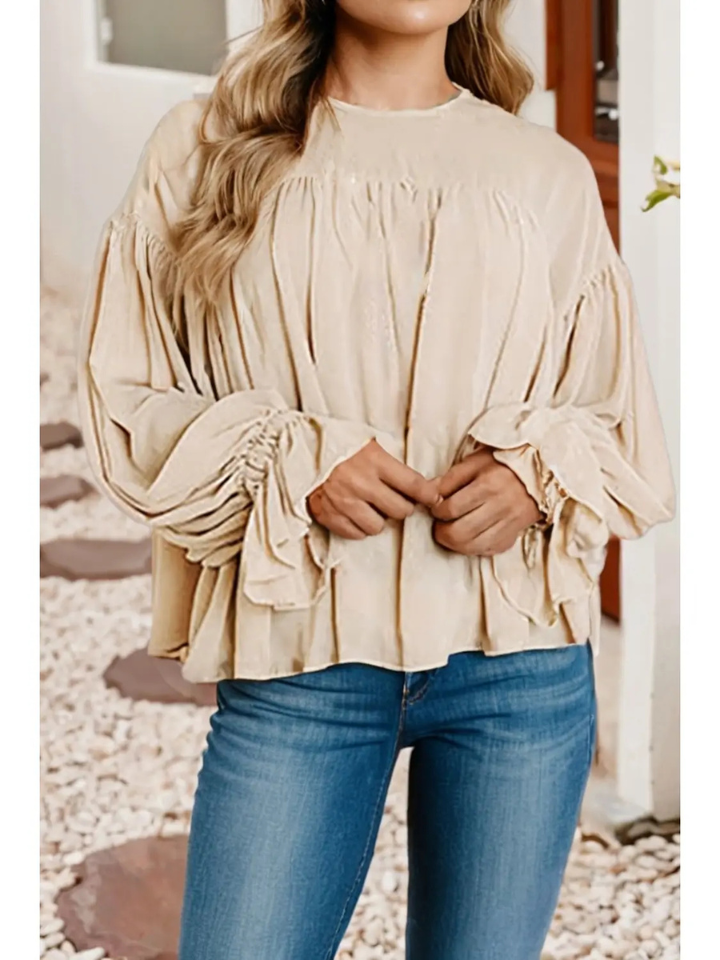 Elegant and effortlessly refined, this parchment-colored blouse brings timeless sophistication to your everyday wardrobe. Crafted from 100% polyester, it drapes beautifully for a lightweight, flowy feel that moves with you. The elastic cuff detailing adds a subtle touch of polish, creating soft shape through the sleeves while keeping the look elevated and tailored. Its minimalist design and elegant silhouette make it easy to dress up or down — perfect for workdays, dinner plans, or cozy fall weekends. A truly versatile piece that proves simple can still be stunning.
