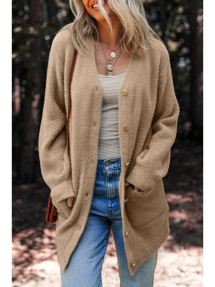 The Solid Color Cardigan Sweater is your go-to layer for cozy comfort and timeless style. Made with a soft, fuzzy knit and an easy, relaxed fit, this cardigan keeps you warm without feeling bulky. Its simple design and functional details make it perfect for layering over your favorite tops, jeans, or dresses all season long.